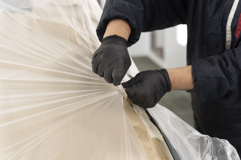 Vinyl or protective materials are carefully applied with advanced tools for a smooth, flawless finish.